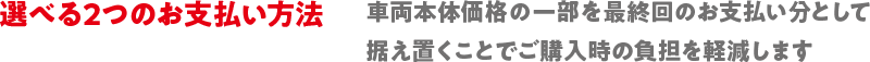 - 最終回でお買い上げ(現金決済・再分割・再残価)をご選択された場合、最終回のお支払額(残価)を含めたお支払合計額は、一般的なローンの方が軽くなる場合があります。